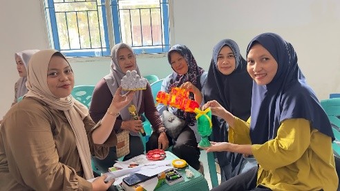 “Kami membuat kipas tangan dari kardus dengan gambar wajah tersenyum, kemudian membuat hiasan dalam rumah dari botol plastik yang bisa digantung dan ditaruh dekat jendela sebagai hiasan di rumah, serta membuat penyimpanan barang serbaguna yang dapat sekaligus mempercantik rumah dari botol plastik. Ide-ide muncul karena teringat anak saya. Anak saya bisa ikut belajar juga membuat produk olahan sampah anorganik,” ujar salah satu kelompok peserta.