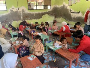 Pada awal kegiatan, peserta tampak masih terdiam dan sedikit bingung dengan kehadiran panitia pelaksana. Namun, setelah dilakukan perkenalan dan penjelasan mengenai tujuan kegiatan, suasana mulai mencair. Peserta menjadi lebih aktif dan bersemangat mengikuti seluruh rangkaian acara. Panitia juga berupaya menciptakan suasana yang nyaman agar kegiatan berjalan lancar dan menyenangkan. Kegiatan diawali dengan pengisian pre-test, di mana peserta diminta memilih gambar makanan yang dianggap sehat. Setelah itu, diberikan edukasi mengenai makanan sehat melalui konsep “Isi Piringku” dengan penjelasan sederhana dan visual yang menarik. Peserta diajak mengenal berbagai jenis makanan seperti sayur, buah, karbohidrat, dan protein.